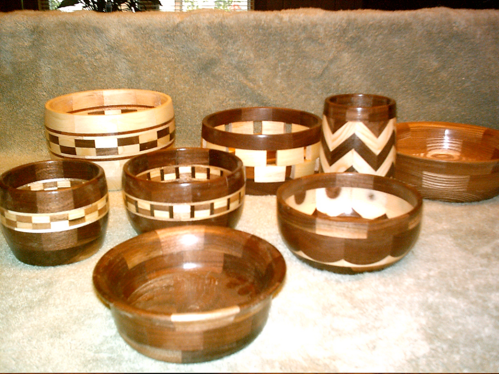 As Gordy’s skill on turning bowls improved he found the basic tools that came with the lathe were too soft or inadequate for the designs he was attempting, so he began building his own. He got some Model A leaf springs and fabricated replacements for the standard ones and also a few unique to his needs. Now he was able to gouge out a bowls rough shape in record time and the new tools held their edge far longer. As his tool and wood inventory grew, his work space shrunk, quite a bit, so he devised a system. On the table saw he would cut each of the segment pieces, which he’d then glue into rings at his work bench beside the saw. Hanging those to dry, he’d glue together a few rings done earlier that week until they formed the rough body of the bowl. In the confined space he only needed to twist his chair around to the lathe and could turn out a bowl from the rings glued up a day or so before. Afterwards he proceeded to finish and stain those bowls, and finally brand his GRF.