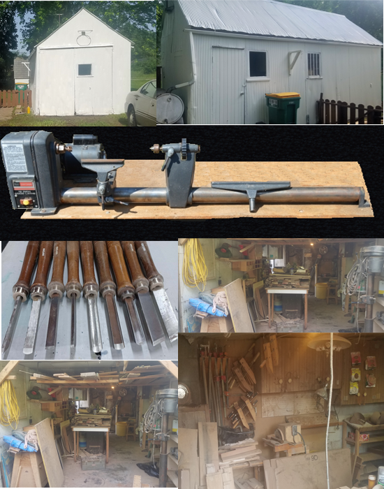 After renting for years, Gordon and Donna bought her childhood home in the 70’s and moved the clan in. The house and a small detached garage had been built circa 1900 and needed many upgrades. Gordy used all his carpentry skills, along with the electrical and plumbing knowledge he’d picked up along the way, to began an extensive remodel of the whole house. Also during this time he began turning the tin sided garage, which had been built to house a Model T sized car, into a work shop. He raised the ceiling, insulated the walls using cardboard, updated the wiring, built cabinets, installed a wood stove and fabricated a wood storage area off the ceiling. Next, he acquired a unique table saw, a drill press and a very nice planer, but ended up building his own band saw and a sanding table. When he bought the lathe it required a complete rearrangement of the garage and the wood stove eventually couldn’t be used safely, limiting his shop time to only warm weather.
