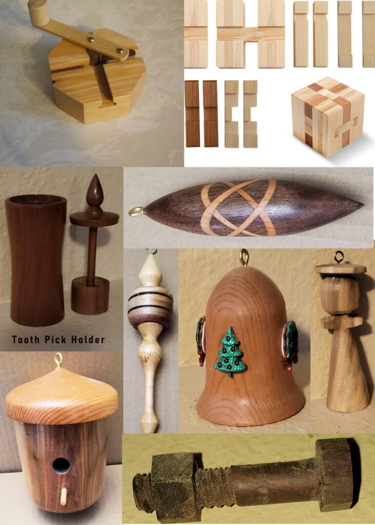 Gordon always loved building unique and intriguing wood items. He made multiple wood puzzles and games over the years for the kids, wood tool boxes for him and a variety of home decorations. A big family favorite was the classic “Bullshit Grinder”. It was a flat block with grooves cut in that two pieces of small blocks could travel in back and forth while connected to a linkage with a handle that you cranked. It didn’t do anything worthwhile, hence the name. Photos of a similar wood block puzzle and BS grinder are to the left, with actual photos of his other works, including one of the many wood bolts w/nut he made. Gordy had a collection of 16 egg shaped pieces turned from different species of wood, to show each ones unique look. His eldest tried to hoax him with a egg shaped petrified wood one as a joke. He created various types of tooth pick holders, pencil cups, miniature wood birdhouses and even crafted some beautiful, small wood flowers. While for the holidays he turned out quite a variety of ornaments, including various wood bells, which he’d usually add decorations to. Finally Gordy made his famous Angels, of which some were colored and most had glitter. Then he built a unique wood tree that his youngest could display a few of her ornaments on. Gordy devised a very unique piece he called his “Inside/Out” ornament, a segmented piece where he hollowed out part of it, cut it in half and re-glued it with the pieces reversed.